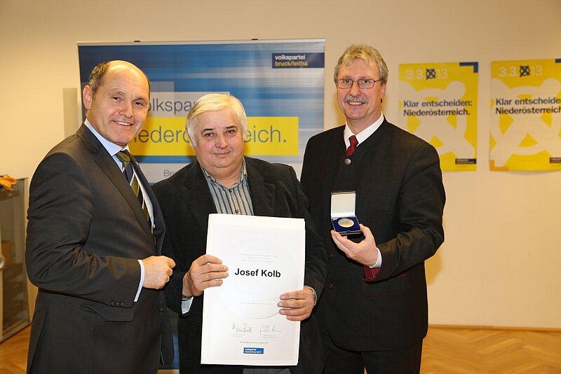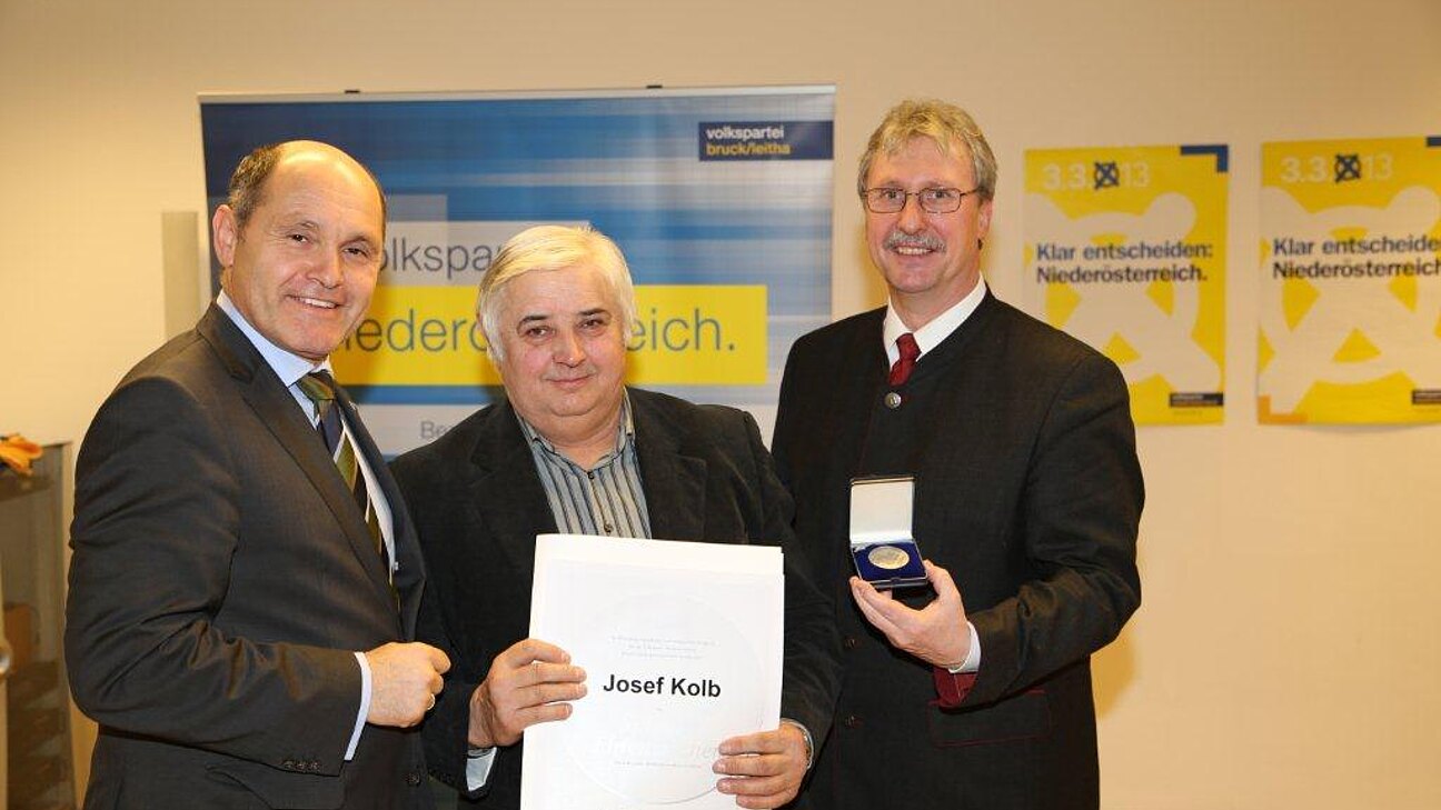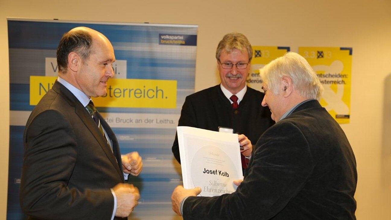 Herr Josef Kolb aus Mannersdorf erhielt vergangene Woche das Silberne Ehrenzeichen der VP Niederösterreich von LH Stvtr. Mag. Wolfgang Sobotka und Bezirksparteiobmann Gerhard Schödinger für seine langjährigen Verdienste (Bauernbundmitglied seit 1962, aktives SB-Mitglied) überreicht.